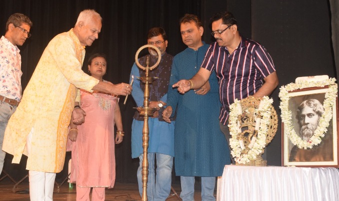 প্রদীপ জ্বালিয়ে অনুষ্ঠানের সূচনা। রয়েছেন গ্লোবাল অ্যাকাডেমি অফ ফাইন আর্টসের চেয়ারম্যান শোভন চক্রবর্তী ও সম্পাদক শুভ্রনীল রায় ও অন্যান্য অতিথিবৃন্দ।